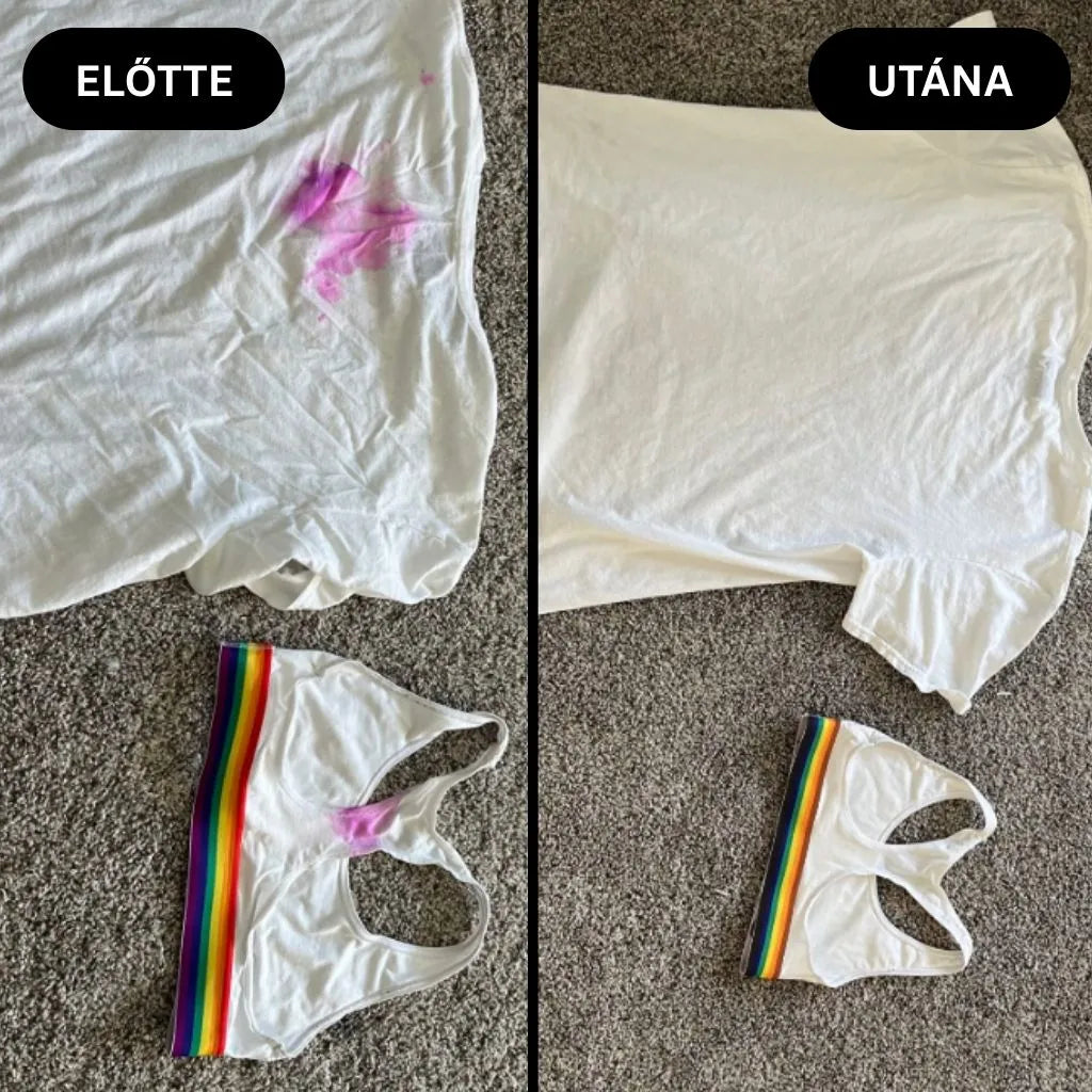 Fehér és színes ruhákon, előkéken, ágyneműn és kárpitokon is alkalmazható a használati útmutató betartása mellett.